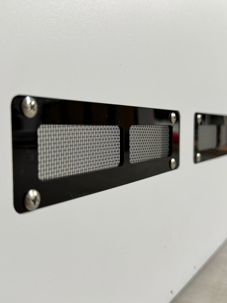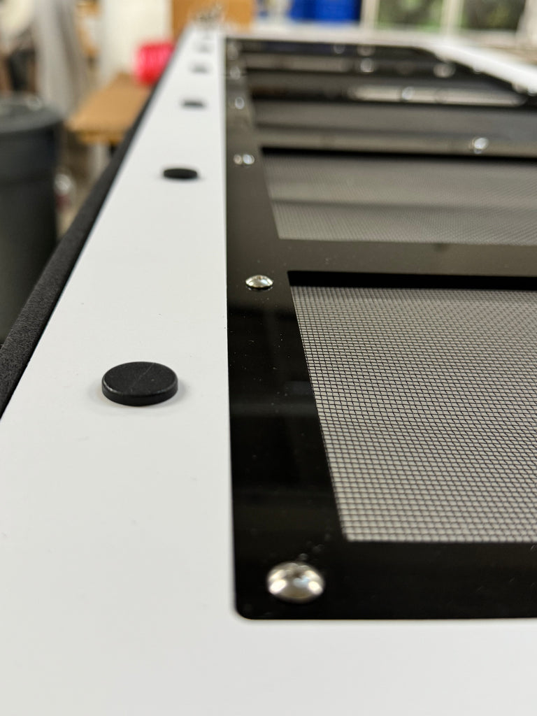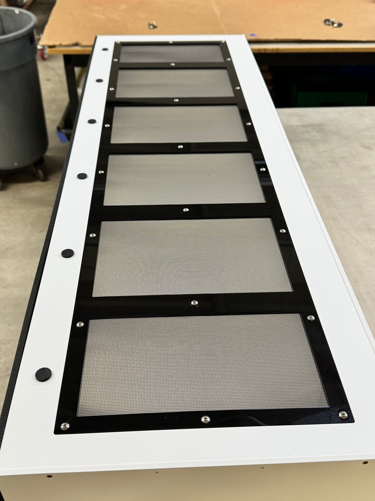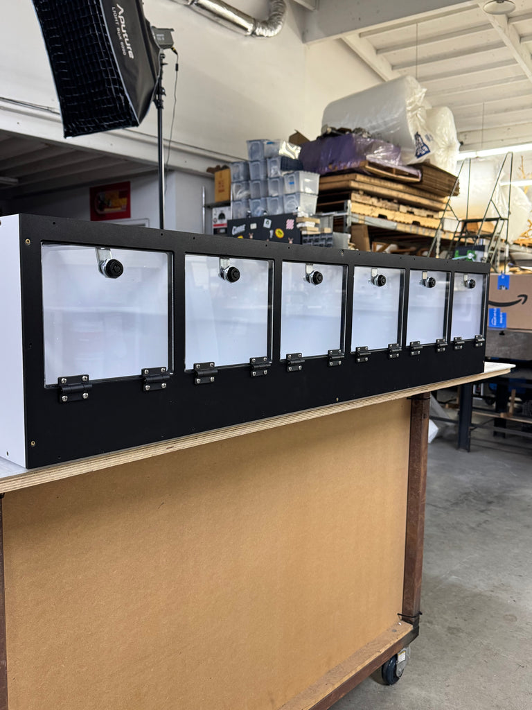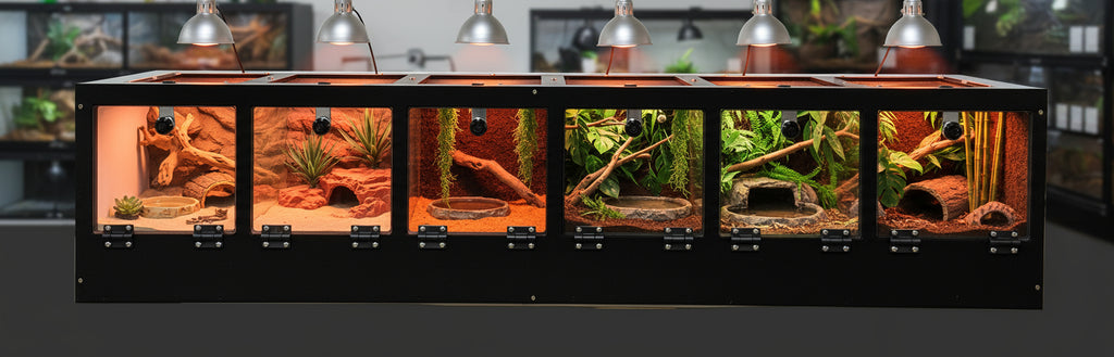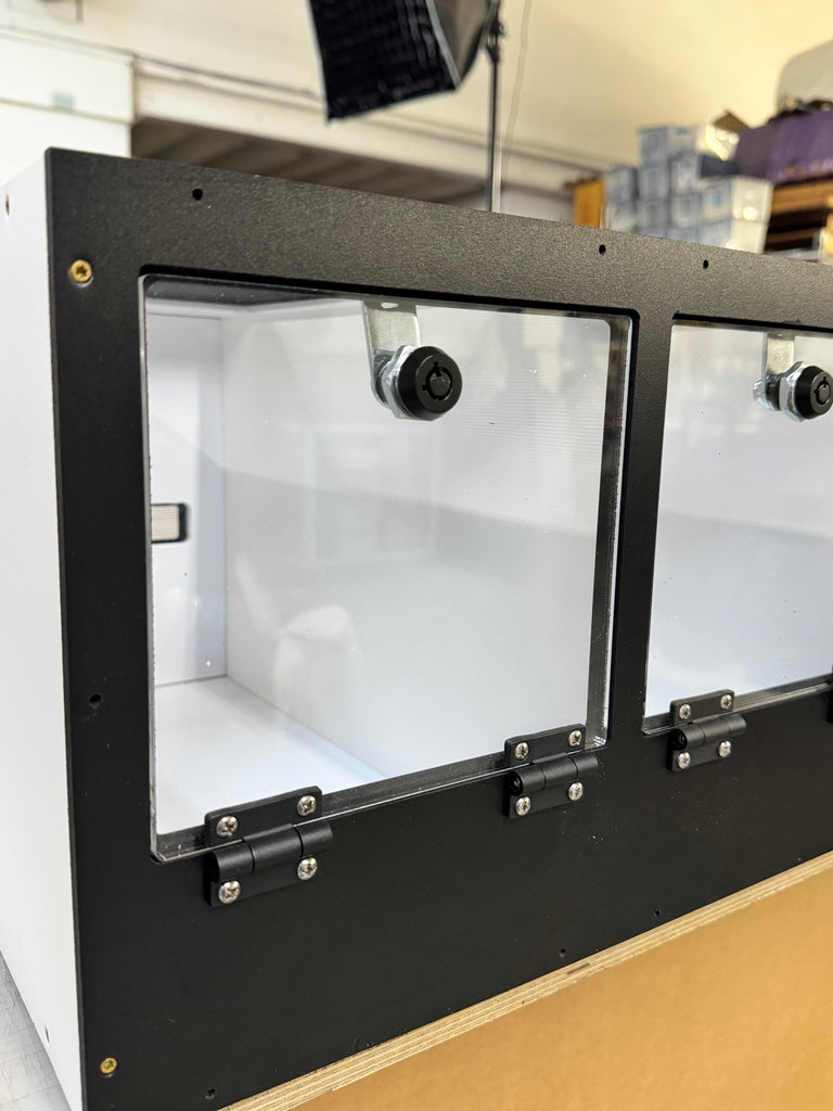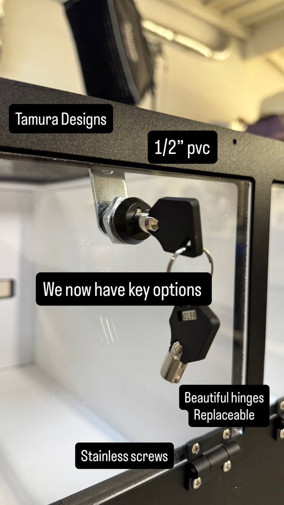 Frame is black 1/2" PVC all CNC CUT 23 3/4" wide x 45 1/4" tall x 17" deep OPTIONS1. LED 2. HEATED BACK 3. UVB T5 FIXTURE 6% 12% 14% The 3 ACRYLIC ENCLOSURES 22.5" wide x 11.5" tall x...