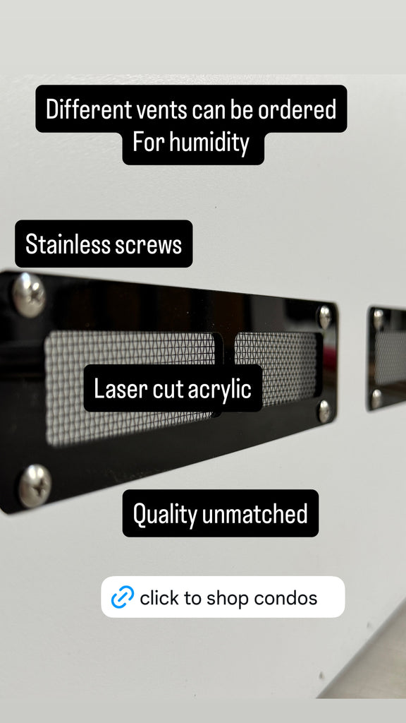 43" wide x 18" tall x 18" deep: Condo 10" wide x 16.5" tall x 16" deep: Each Compartment 1/2” pvc black front and insides white, vents on back solid acrylic door Dado grooved cnc machined heavy duty hinges heavy...