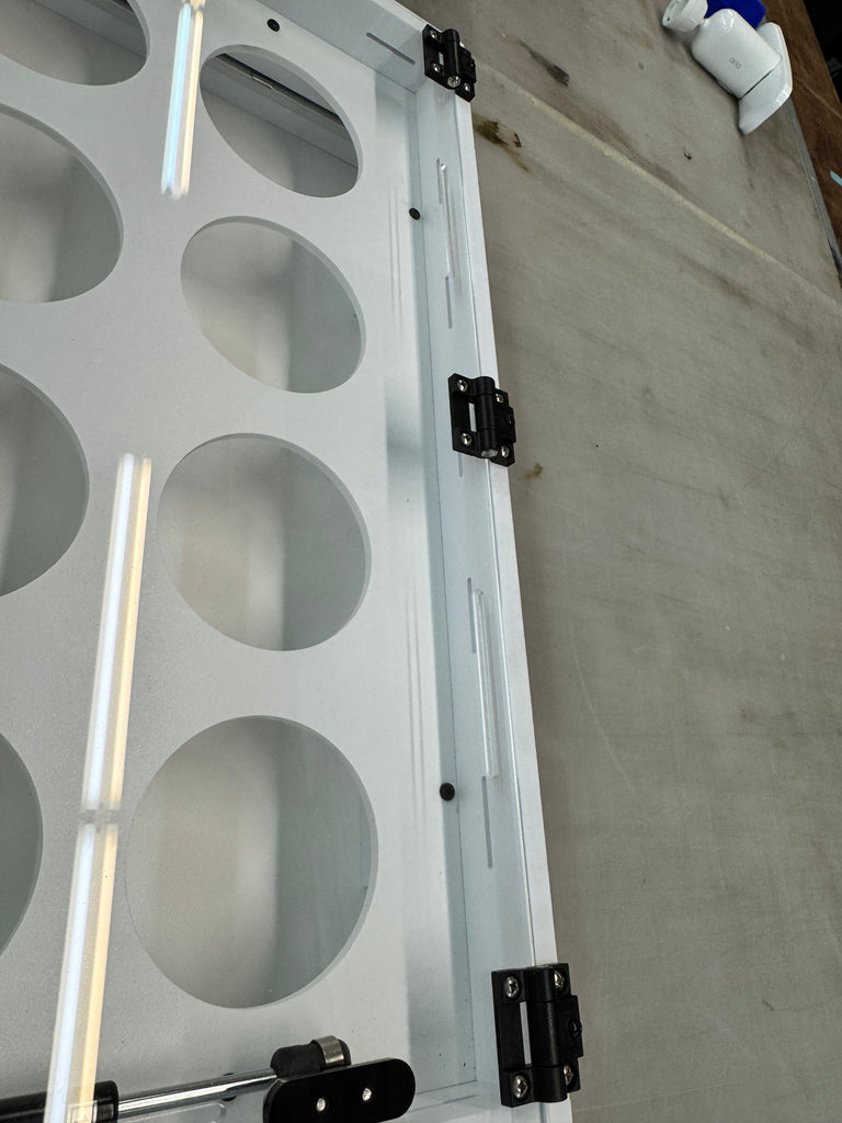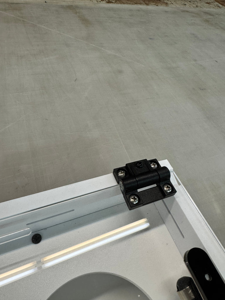 HEAVY DUTY HINGES THAT MATCH THE PORPORTION OF THE UNIT WITYH STAINLESS STEEL SCREWS.